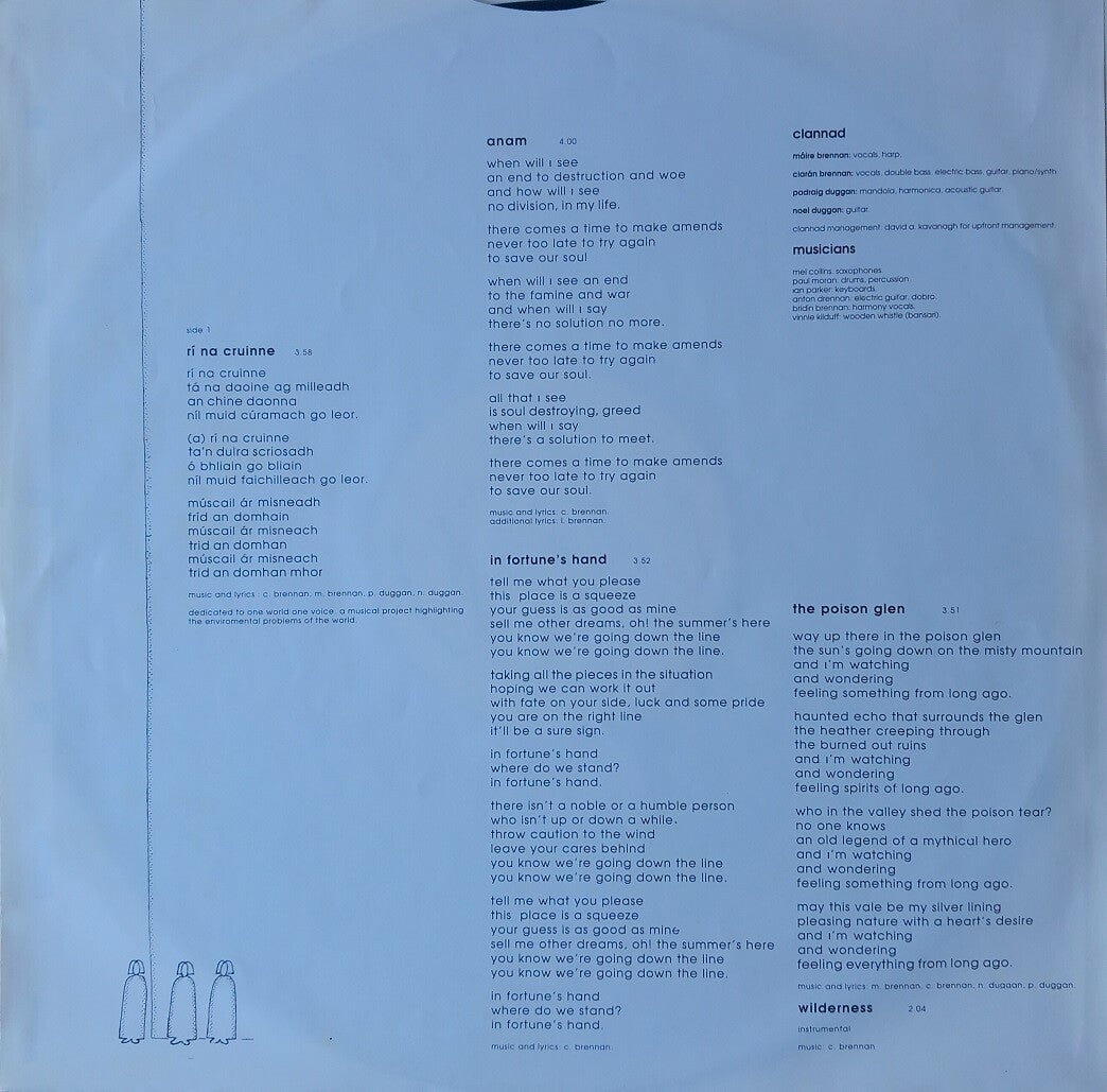 A: Rí Na Cruinne (3:58) / Anam (4:00) / In Fortune's Hand (3:52) / The Poison Glen (3:51) / Wilderness (2:04)