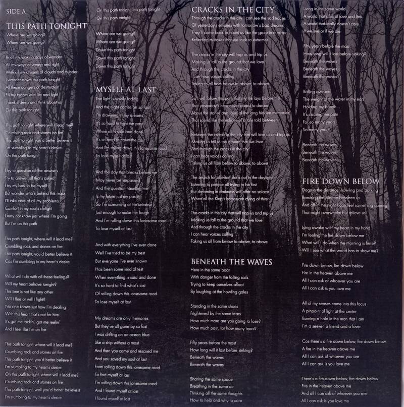A: This Path Tonight (4:28) / Myself At Last (5:19) / Cracks In The City (3:42) / Beneath The Waves (4:03) / Fire Down Below (3:29)
