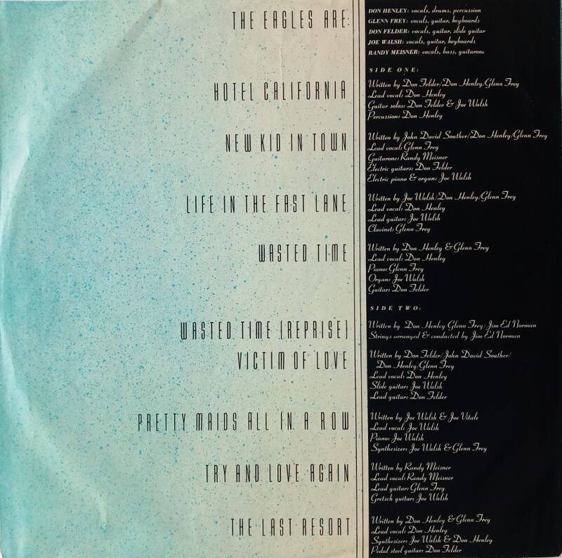 A: Hotel California (6:30) / New Kid In Town (5:04) / Life In The Fast Lane (4:46) / Wasted Time (4:55)
