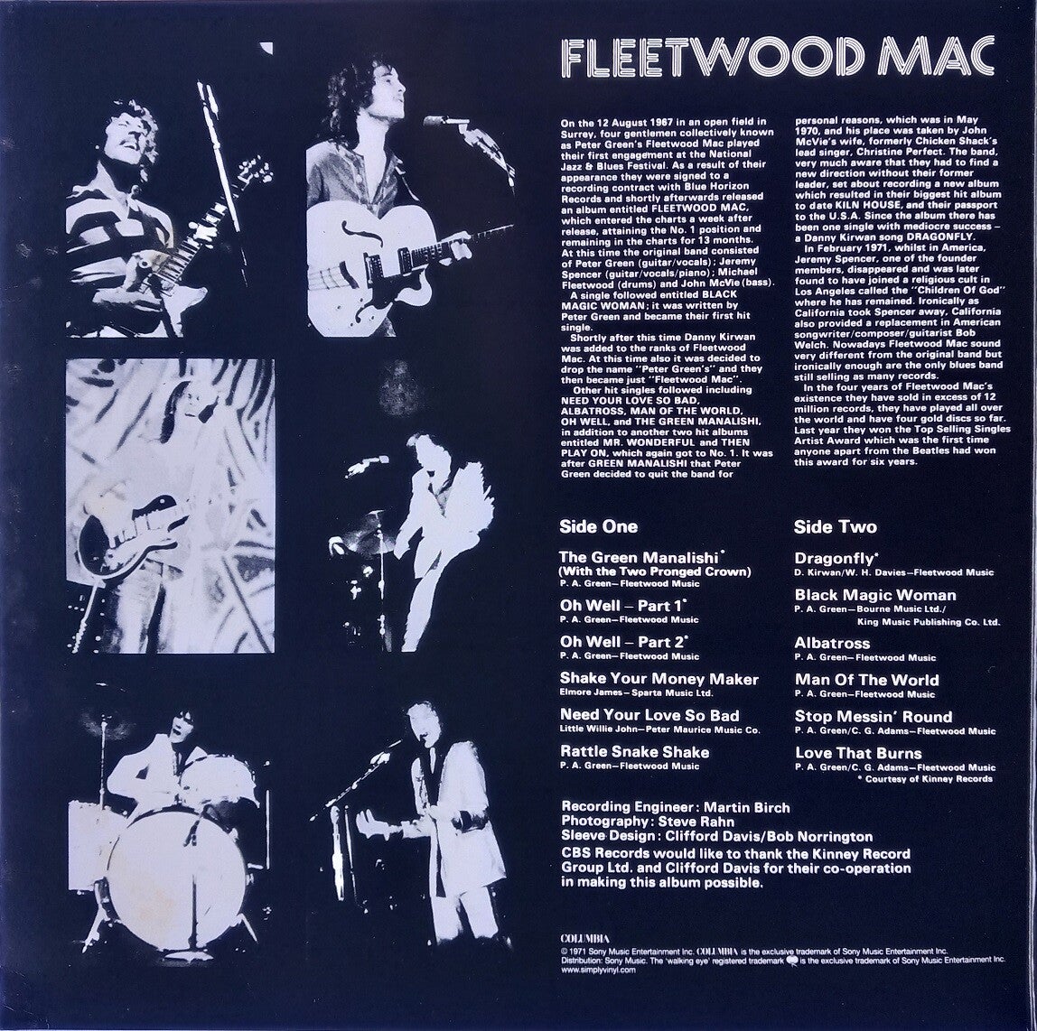 A: The Green Manalishi (With The Two Pronged Crown) (4:37) / Oh Well - Part 1 (3:29) / Oh Well - Part 2 (5:40) / Shake Your Money Maker (2:54) / Need Your Love So Bad (3:53) / Rattle Snake Shake (2:05)