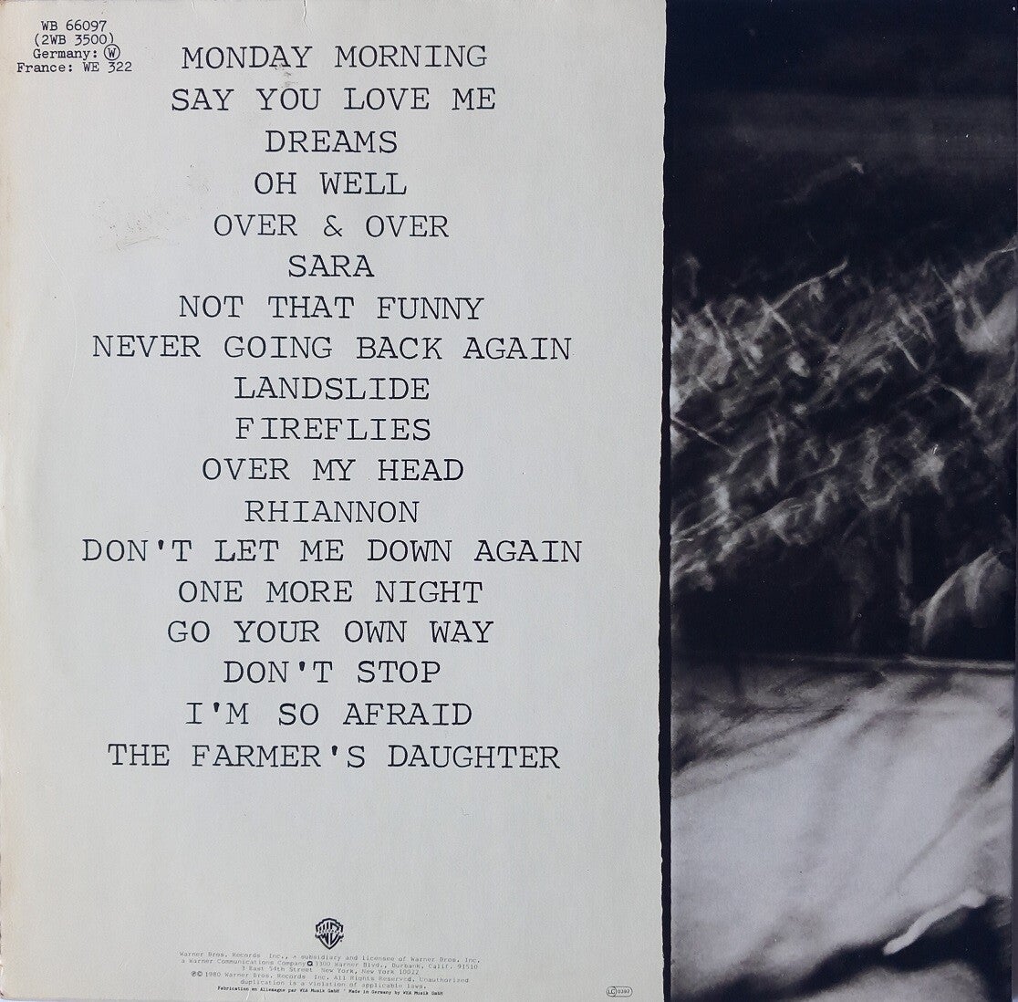 B: Say You Love Me (4:11) / Landslide (3:05) / World Turning (4:25) / Sugar Daddy (4:09) / I'm So Afraid (4:15)