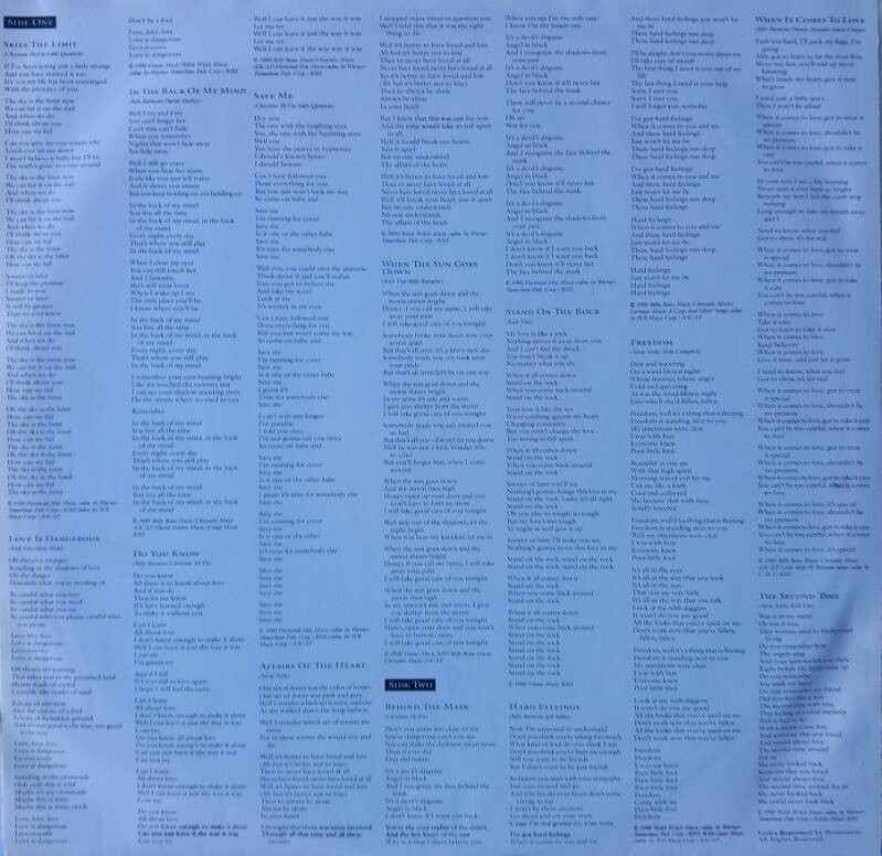 B: Behind The Mask (4:17) / Stand On The Rock (4:01) / Hard Feelings (4:51) / Freedom (4:10) / When It Comes To Love (4:05) / The Second Time (2:31)