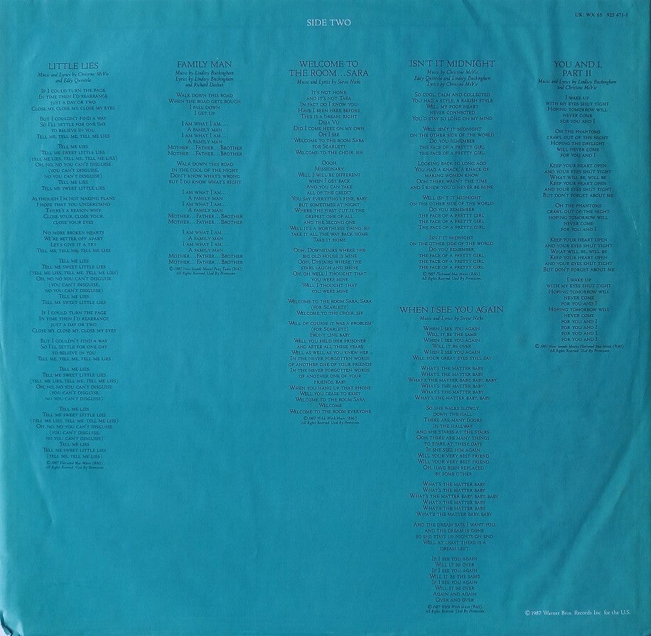 B: Little Lies (3:38) / Family Man (4:01) / Welcome To The Room...Sara (3:37) / Isn't It Midnight (4:06) / When I See You Again (3:47) / You And I, Part II (2:40)
