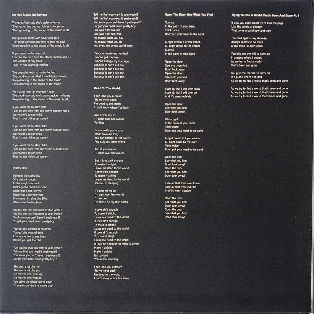 A: I'm Not Giving Up Tonight (4:02) / Pretty Boy (4:48) / Dead To The World (4:09) / Open The Door, See What You Find (3:59) / Trying To Find A World That's Been And Gone Pt. 1 (2:58)