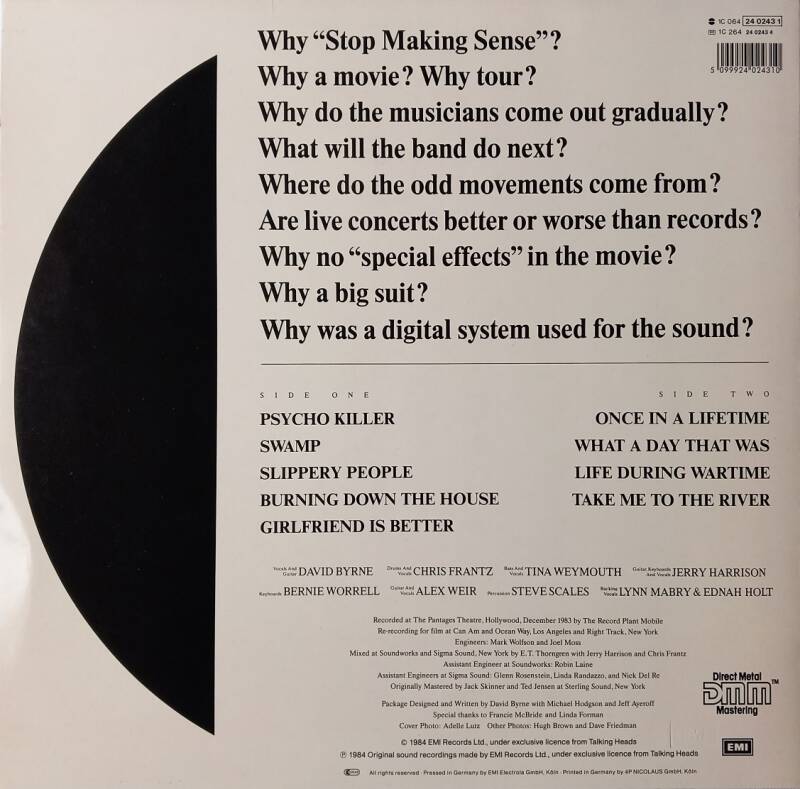 A: Psycho Killer (4:19) / Swamp (3:50) / Slippery People (3:35) / Burning Down The House (4:00) / Girlfriend Is Better (3:33)