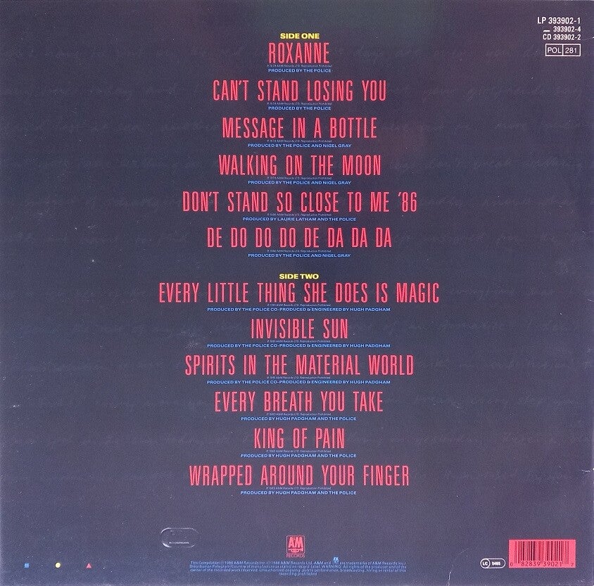 A: Roxanne (3:11) / Can't Stand Losing You (2:47) / Message In A Bottle (4:50) / Walking On The Moon (5:01) / Don't Stand So Close To Me '86 (4:40) / De Do Do Do De Da Da Da (4:06)